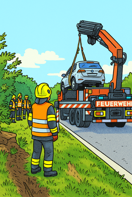 Vermutlich kam der Mercedes von der Straße ab und knallte mit der B-Säule an einem Baum. Als wir ankamen war die verletzte Person bereits im Rettungswagen abtransportiert und wir mussten noch den PKW bergen.
