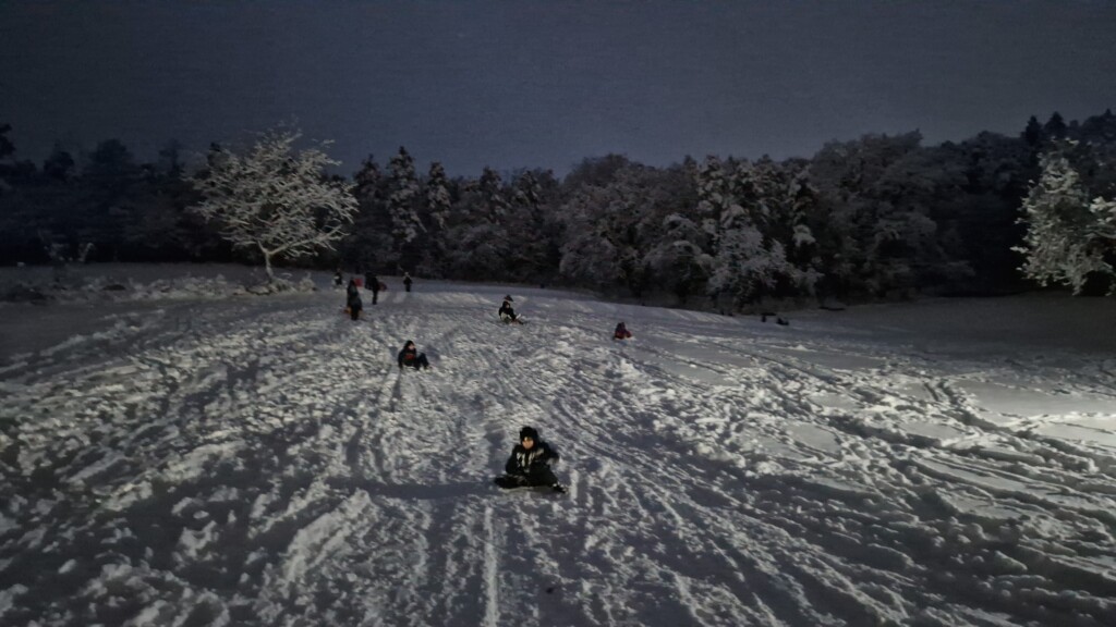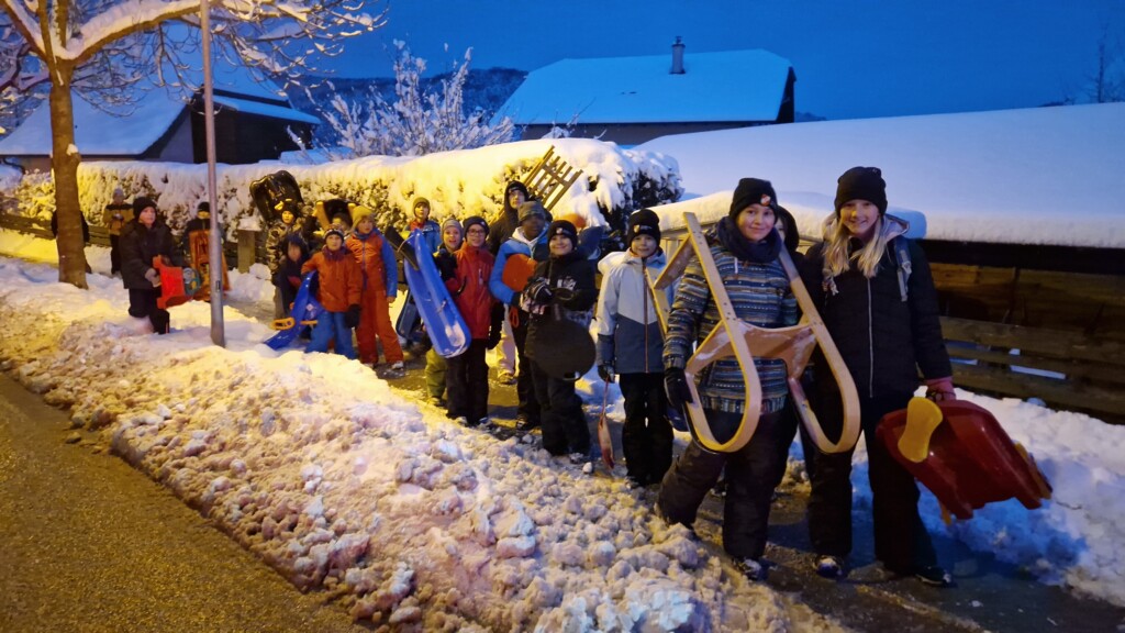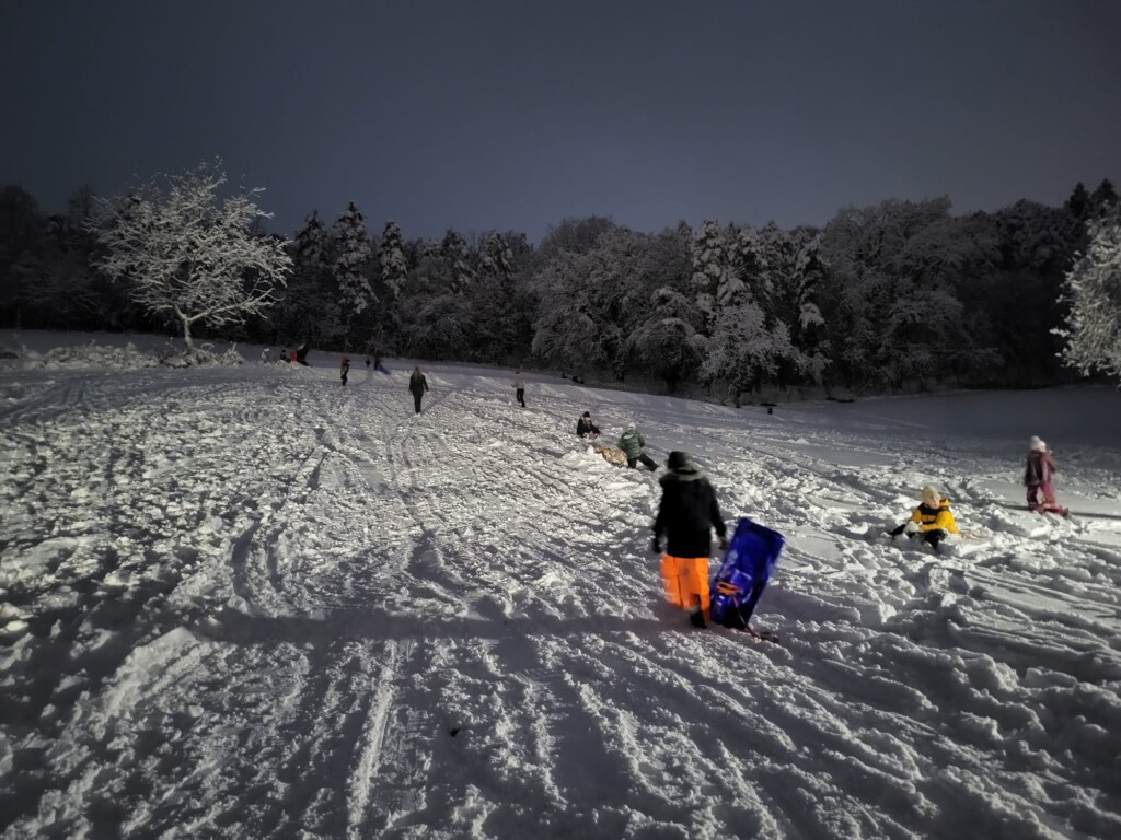 Für ganze zwei Stunden hieß es: rauf auf den Hügel und mit vollem Tempo wieder hinunter! Mit Bobs, Schlitten und Rodeln ging es etliche Male den Hang hinab. Natürlich durften auch selbstgebaute Schanzen nicht fehlen – die Begeisterung und der Ehrgeiz der Kids waren deutlich zu spüren.