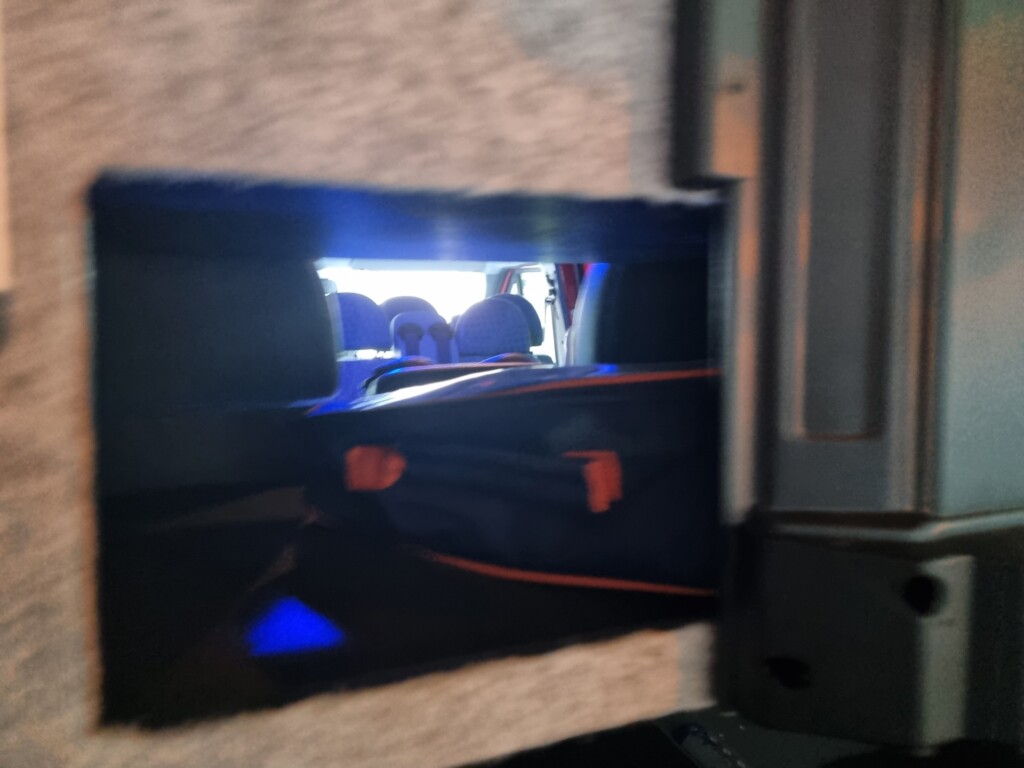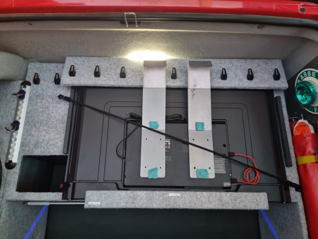 Weiters ist ein Fernseher, welcher außen auf die Schiebetür gehängt werden kann, für die erweiterte Lageführung vorhanden.